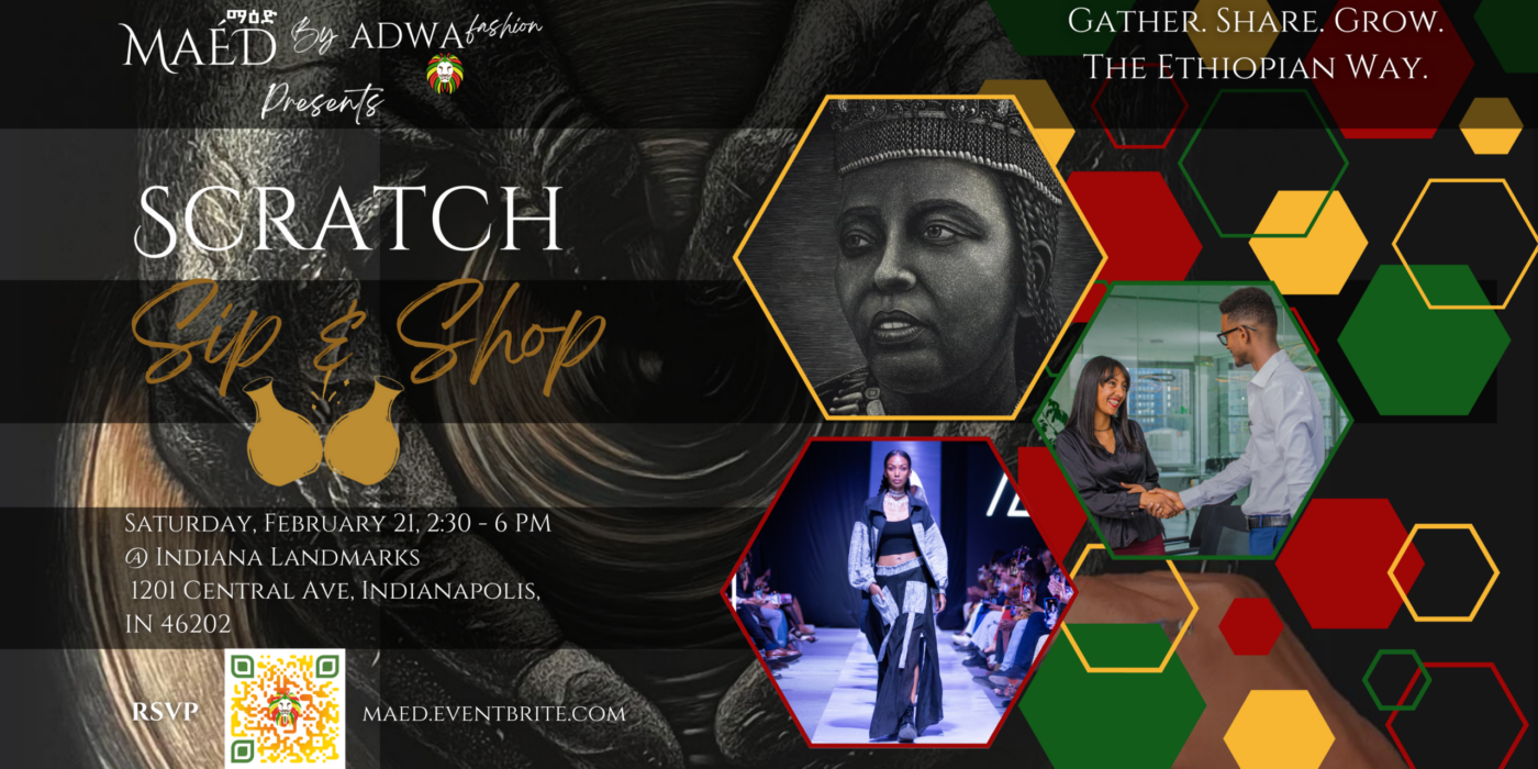 Maèd (ማዕድ – Feast), a cultural and networking event focused on the richness of Ethiopian heritage, hosts its second annual event at Indiana Landmarks Center, featuring a panel discussion with community leaders like Ms. Aster Bekele (former chemist at Eli Lilly and Founder & CEO of Felege Hiwot), select business pitches, networking, a scratch board art class by Esayas Zerazion while sipping special Ethiopian honey wine or coffee, and shopping curated handmade contemporary Ethiopian fashion and accessories.